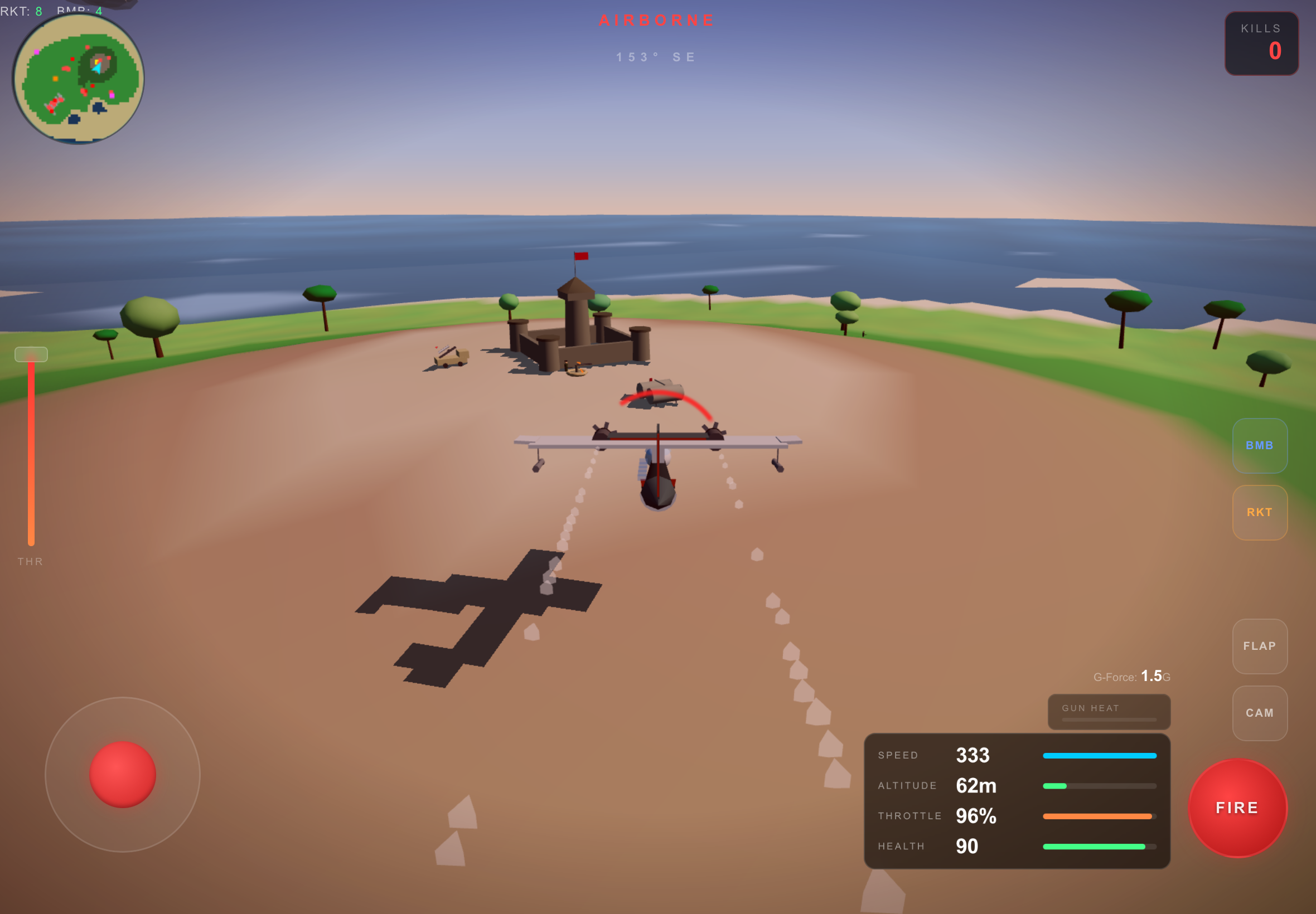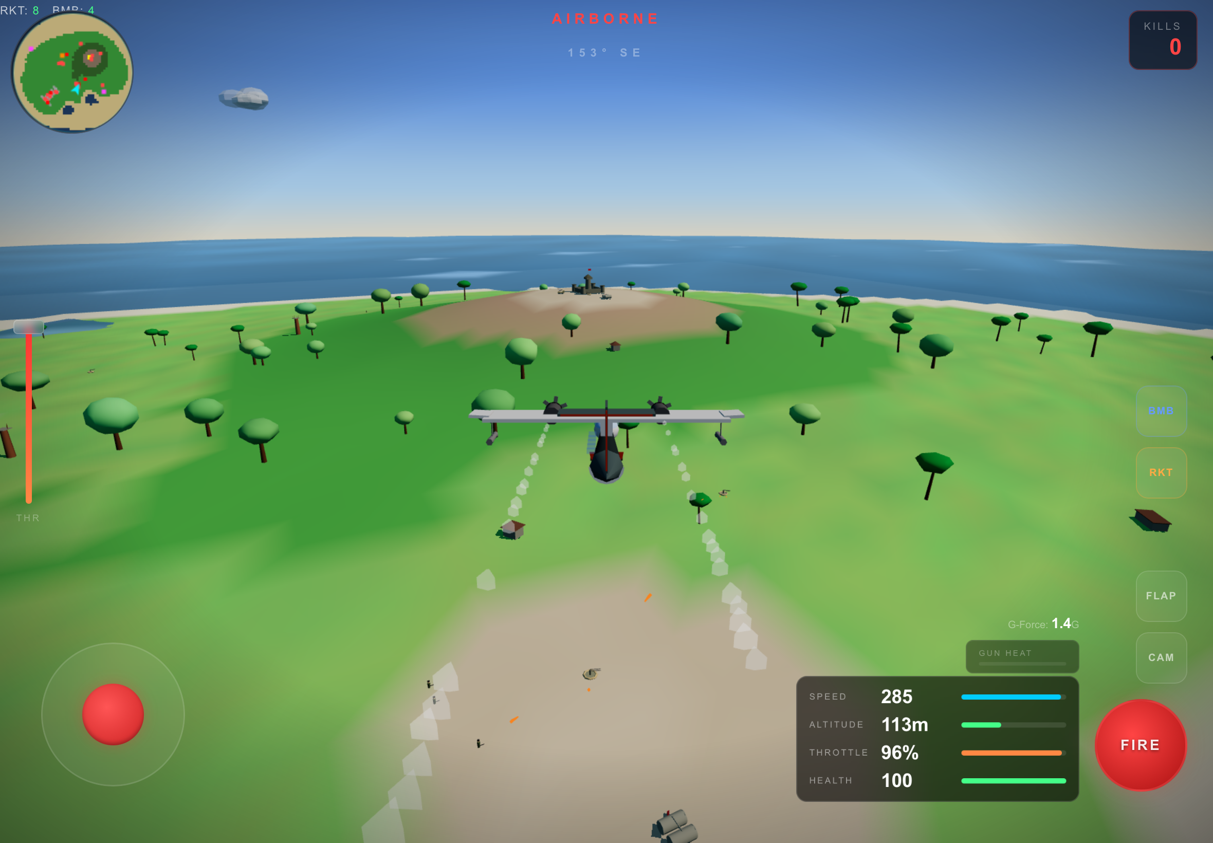 The Expendables: Seaplane Strike is a 3D aerial combat game. You fly an HU-16 Albatross seaplane over a procedurally generated tropical island, strafing enemy positions with twin nose guns, rockets, and bombs. Full 6-DOF flight physics. Seven enemy types. A gun heat system. Landing gear. Dual camera modes. A minimap. A complete HUD with speed, altitude, throttle, health, compass, and G-force readout. Mobile-optimized touch controls with a virtual joystick and haptic feedback. Procedural audio — no audio files at all, everything synthesized in real-time.