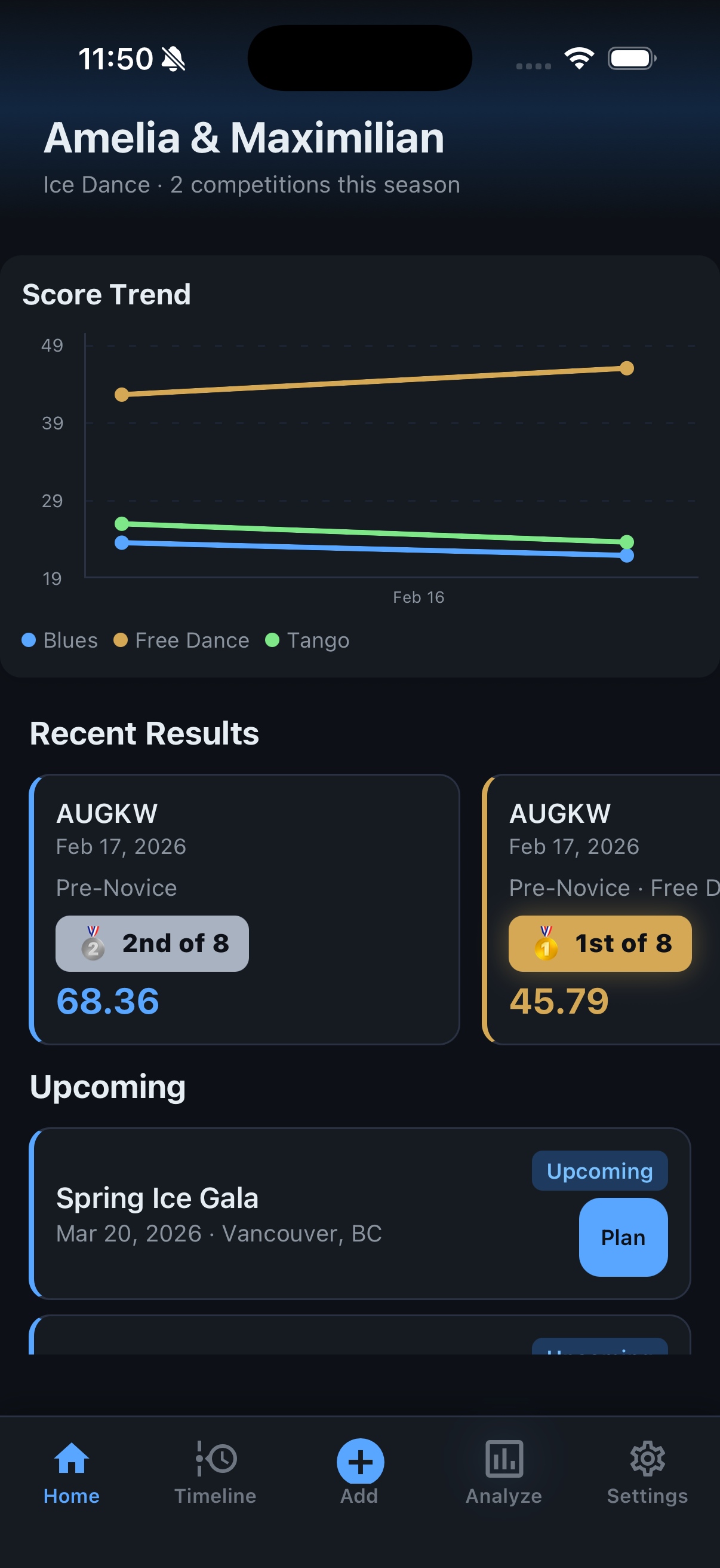 When I tell people this, they assume I'm exaggerating. They think I'm describing a demo, or a proof of concept with no real functionality. I'm not. It's a working app — still actively in development and targeting release ahead of the next skating season — with a Supabase backend, competition tracking, AI-powered predictions, score visualizations, and a full dark-themed UI.